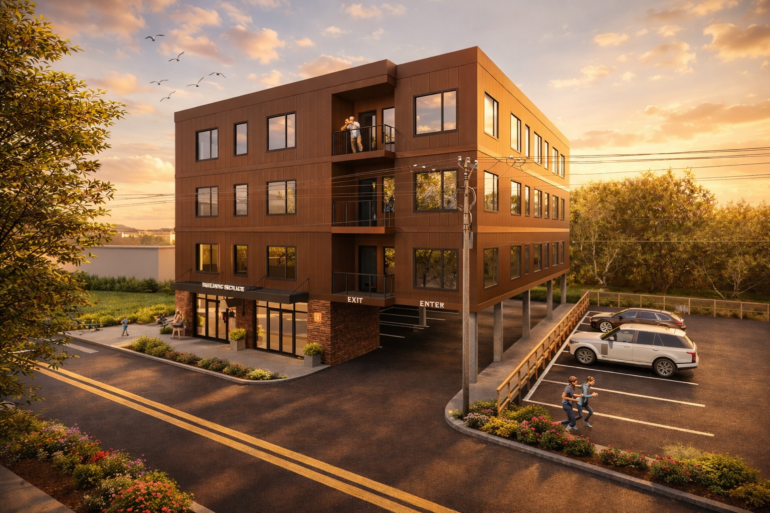 Designed to align with the intent of the FBC goals, the building emphasizes an active street presence, efficient residential density, and architecture scaled to the surrounding downtown context. Ground-level frontage, clear pedestrian access, integrated parking, and upper-level residential units work together to support a more vibrant and connected neighborhood environment.