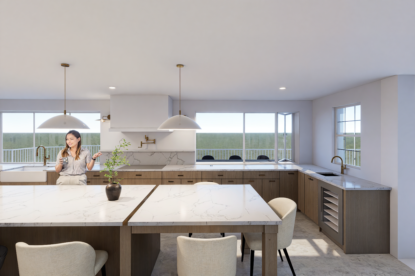 At the center of the space, dual oversized islands provide generous room for meal preparation, casual seating, and hosting family and guests. Perimeter cabinetry is paired with crisp stone surfaces and soft neutral finishes, creating a clean, timeless palette that feels elevated yet approachable.